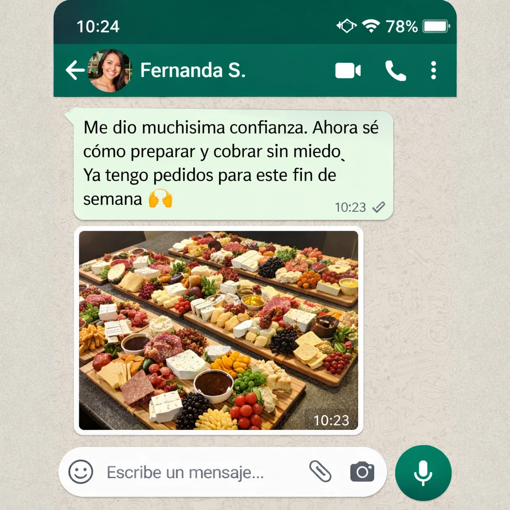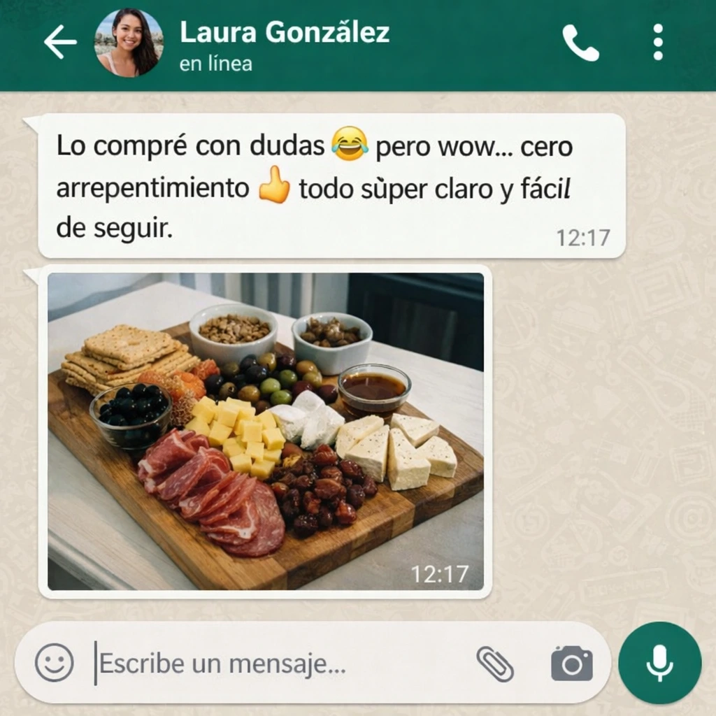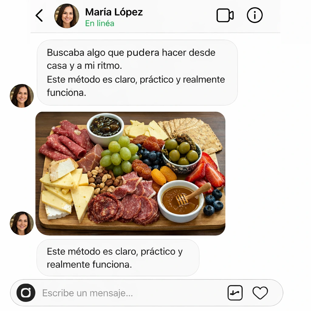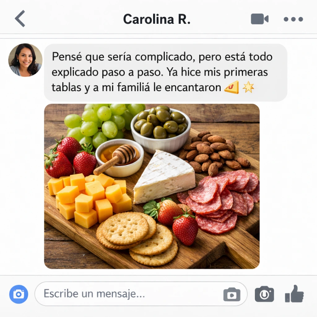 Sin experiencia en cocina, sin grandes inversiones y desde tu propia cocina: un método paso a paso para diseñar, presentar y vender tablas que enamoran a tus clientes y convierten cada pedido en ganancia real.